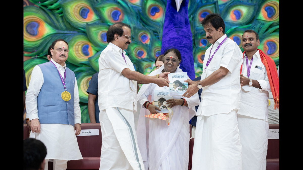 The amalgamation of soil from around the world served as a poignant symbol of unity, emphasizing the eternal bond between humanity and nature. Amma herself planted a sandalwood sapling in this sacred mixture, a tree symbolizing purity and divinity. Dignitaries on the stage were then invited to water it, signifying the collective nurture and care from devotees worldwide. This sapling, enriched with the combined love and devotion of individuals from across the globe, is set to flourish here in Amritapuri, serving as a living testament to the enduring connection between people and the environment. The occasion marked a celebration of oneness, unwavering dedication, and the profound connection between humanity and our planet, instilling a sense of optimism and motivation for a more luminous and harmonious global future.